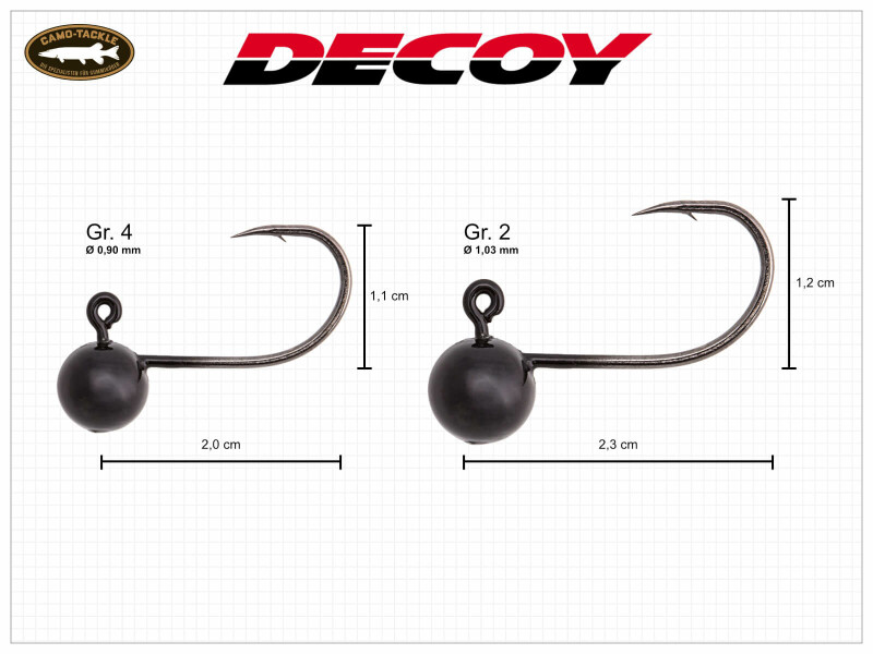 Mini Jigkopf Größe #2 und #4 in Gewichten von 0.9 Gramm, 1.8 Gramm, 2.5 Gramm und 3.5 Gramm. Das besondere an den Decoy SV-30 Chinu Heads ist, dass sie durch den freien Hakenschenkel die Softbaits bei der Montage nicht aufreißen und somit oft unbrauchbar machen.