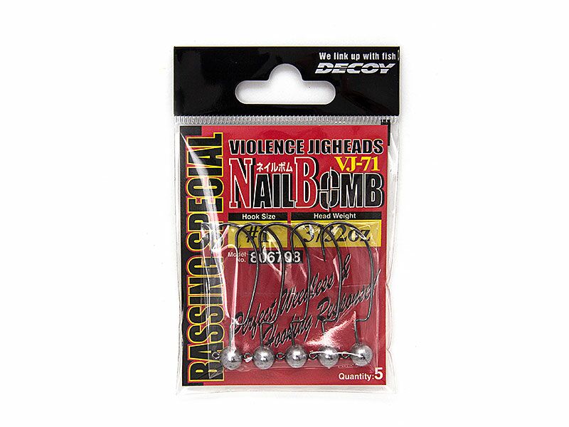 Beim Nail Bomb VJ-71 handelt es sich um eine praktische Verschmelzung von Jigkopf und Wide Gap Haken, die eine Vielzahl an Einsatzmöglichkeiten zulässt. Da die sehr scharfe Hakenspitze bei der Beköderung am Rücken des Gummifisches anliegt, wird eine nahezu kraut- und hängerfreie Angelei begünstigt. Mit dem Nail Bomb VJ-71 werden Köder von 3″ bis 4″ gefischt.