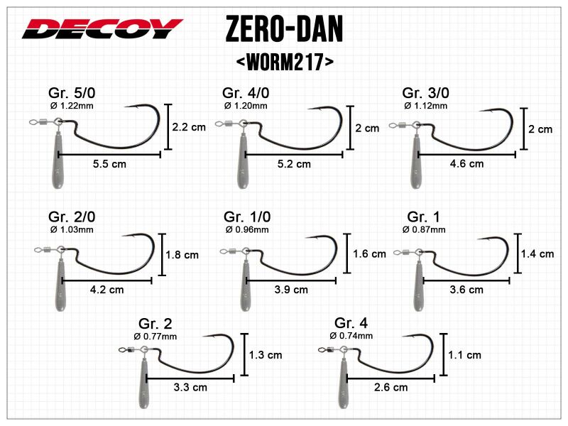Der ZERO-Dan Worm217 von DECOY stellt ein fertig montiertes Jika Rig dar, welches vor allem für die Angelei auf Barsche zum Einsatz kommt. Die einzelnen Komponenten sind hochwertig gewählt. Blei und Haken sind an einem Wirbel angebracht, um maximale Beweglichkeit zu garantieren. Durch das vorgeschaltete Stabblei sind sehr weite und gezielte Würfe möglich. Dank des Wide Gap Hakens eignet es sich zudem für den Einsatz im Hindernis. Besonders in Kombination mit auftreibenden Ködern wird ein verlockendes Köderspiel erzeugt.