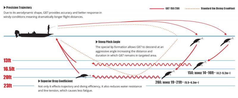 Das Geheimnis dahinter liegt in dem speziellen Gewichtstransfersystem. Dabei fixiert das starke Neodym Magnet die vergrösserte Stahlkugel während der Schwimmphase quasi ausserhalb des Körpers im hinteren Teil der Tauchschaufel. Der Schwerpunkt wird dadurch extrem nach vorne verlagert und die besonders steile Körperstellung ermöglicht das schnelle Abtauchen. Die Stahlkugel gelangt während des Wurfes weit nach hinten und der daraus resultierende verlagerte Schwerpunkt ermöglicht die rekordverdächtigen Wurfweiten. Der Crank G87 befindet sich dadurch deutlich länger in Sichtweite des Räubers.