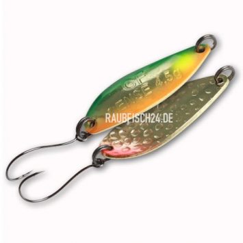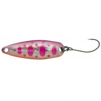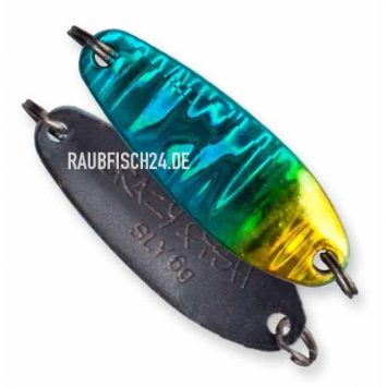 Der Löffel des Miu Native ist leicht gewölbt, perlmutbeschichtet und mit entgegen gesetzt gebogenen Ösen am oberen und unteren Ende versehen. Ausgestattet mit einem kleinen Schonhaken und zwei Sprengringen lässt sich der 5 Gramm schwere Miu Native Awabi an einer leichten Forellenrute mit Powerrating UL oder XUL am besten führen.