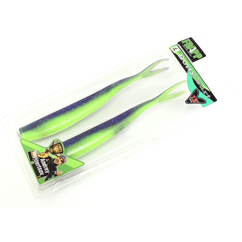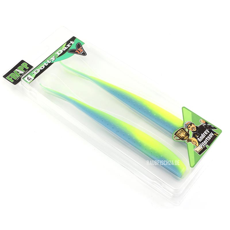 Der Frapp Dotty Dart 8.5 ist der Vertikalangel-Köder schlechthin! Aber auch geworfen bringt er regelmässig schöne Fische. Dazu wird der Dotty Dart ganz normal mit einem Jigkopf gefischt. Bei jedem Anzupfen und bei jedem Auftreffen des Jigkopfs auf dem Grund wippt der V-Schwanz hin und her, ähnlich wie bei einem flüchtendem Beutefisch. Auch am Drop Shot Rig ist der Dotty Dart in seinem Element. Einfach durch die Nase angeködert (nose hooking) reizt er besonders Barsche und Zander. Die natürliche Körperform und die große Farbauswahl lassen keine Wünsche offen und man ist für jede Situation am Wasser bestens gerüstet.