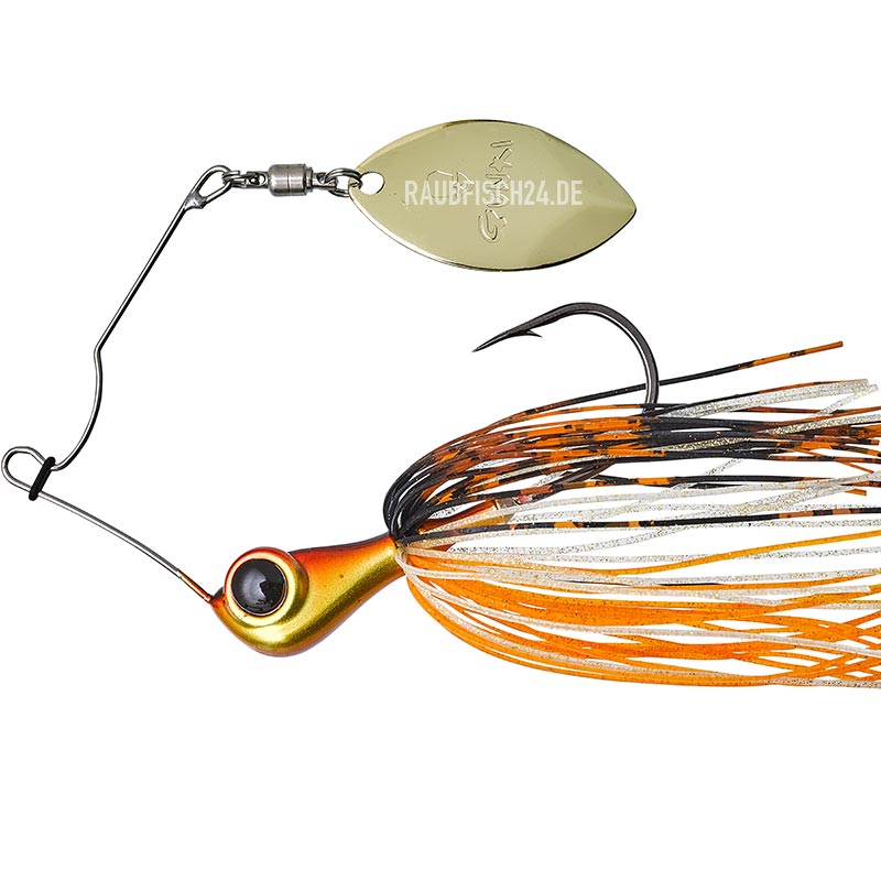 Die Größe des Gennaker ist perfekt für Angler, die es auf Bass und Barsch abgesehen haben. Der kompakte Spinnerbait ist inspiriert vom Design des BOOOMER, mit Signalauge, tiefem Schwerpunkt und perfekter Balance. Die Form des Blade wurde von GUNKI entworfen, in Verbindung mit dem Kugellager-Wirbel fängt es sofort an zu drehen, sobald der Köder im Wasser ist. Starke Vibrationen werden emittiert, ohne zuviel Widerstand beim Einholen zu erzeugen. Der Stahl ist mit 0,9mm stabil genug um die Power des Blade zu kontrollieren. Ein Köder für aktives Angeln, lässt sich gut werfen, er kann auch in Krautlöcher oder Unterstände ‚geflippt‘ werden, wo sich oft die Großen aufhalten. Der Köder ist effektiv beim Fallen, slow roll oder full Speed. Weil sich auch Hechte für ihn interessieren, wurde der Skirt mit bissfester Stahlseide montiert. Haken 2/0. Körper Wismut-Zinn. O-Ring am Draht für den Karabiner.