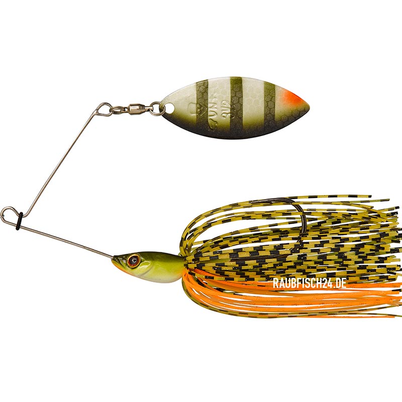 Der Spinnaker ist ein Spinnerbait der Extraklasse! Sein speziell geformter Kopf garantiert einen tiefen Schwerpunkt, Grundvoraussetzung für eine gute Balance beim einkurbeln und in der so wichtigen Sinkphase an gespannter Schnur. Auch beim fischen in Hindernissen ist ein stabiler Lauf Pflicht, nach Kontakt mit Holz oder Pflanzen, muss der Spinnerbait sofort in seine Ausgangslage zurück, um fängig zu sein. Der Silikon Skirt ist aus 24 separaten Fäden hergestellt, für möglichst ‚flüssigen‘, natürlichen Lauf. Ein 0,9mm dicker Edelstahldraht hat genau die richtige Stärke und Flexibilität, das große Willow Blatt erzeugt den wichtigen ‚Fallschirm-Effekt‘ beim sinken. Ein High Quality Wirbel erlaubt sofortiges rotieren des Blattes, das Blatt selber wird durch einen Lötpunkt am Platz fixiert, der Silikon Skirt ist mit Draht befestigt. Ein realistisches 3D-Auge, sicherer Halt für einen Trailer, O-Ring am Einhängepunkt…hier handelt es sich um einen vielseitigen und top verarbeiteten Spinnerbait, so wie er sein sollte! Willow #3.5 Blatt und Mustad 2/0 Haken.