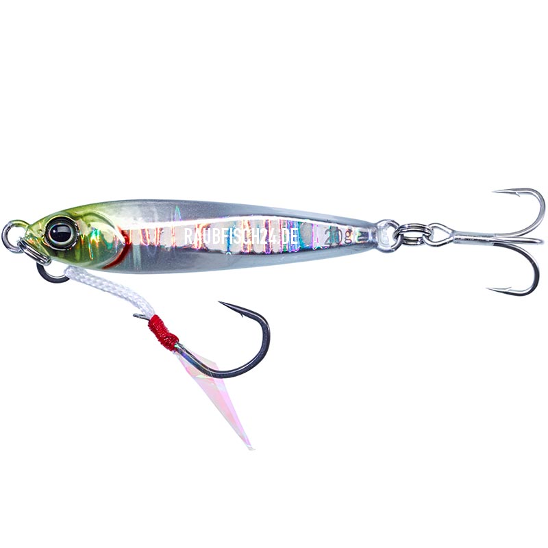 Der Illex Big Backer Jig ist ein Casting-Jig mit dem Schwerpunkt nach hinten, der beim Weitwurf hilft, bestimmte Stellen zu erreichen oder raubende Fische anzuwerfen. Der kompakte, birnenförmige Körper eignet sich für deutliche Twitches und Jerks, die sowohl bei extrem langsamer als auch bei schneller Geschwindigkeit gesetzt werden können. Ideal zum horizontalen Jiggen, um Beutefische zu imitieren, die vor Meeresräubern wie Barsch, Seelachs, Makrele, Bonito oder Blaubarsch fliehen. Die Flanken sollen diese Bewegungen betonen und die Kombination von Farben und Reflexionen der holografischen Beschichtung verstärken den Reiz. Der Big Backer Jig ist ein sehr vielseitiger Köder für alle Wurf- und Einholtaktiken wie vertikales Jiggen vom Boot aus und Ufer-Jigging. Der Big Backer Jig verfügt über einen Assist-Haken und ein Blatthologramm am Kopf sowie einen Drillingshaken am Schwanz.