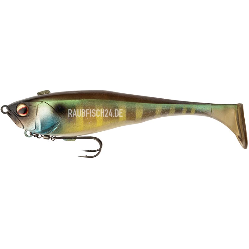 Der DUNKLE 9′ ist ein Soft Swimbait vollgepackt mit den gleichen innovativen Features, wie seine kleineren Brüder! Designed für Big Bass und Großhecht, er eignet sich perfekt für Skipping ins Gehölz oder unter Stege. Der DUNKLE ist bewaffnet mit einem superscharfen Doppelhaken, der mit Splitring und Wirbel montiert ist. Der Doppelhaken selbst wird in einem Clip in der optimalen Position festgehalten, aber nur bis zum Biss, danach kann er frei rotieren. Um auch über steinigem und hindernisreichen Grund effektiv fischen zu können, kann man an der unteren Öse den Doppelhaken entfernen, dort ein Gewicht einhängen und den Doppelhaken auf dem Clip am Rücken montieren! Genial! Der bullige Kopfbereich verjüngt sich recht schnell zum mächtigen Schwanzteller hin, dadurch lässt sich der DUNKLE erstaunlich langsam fischen. Eine multifunktionelle Swimbait-Alternative für große Räuber!