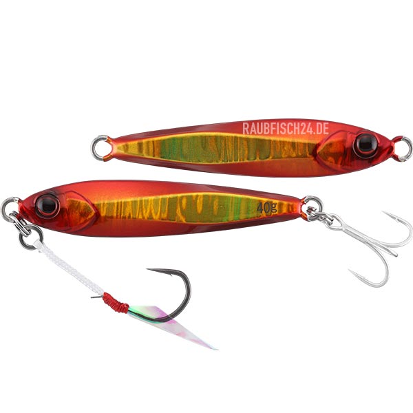 Der Jackall Big Backer Jig ist ein Casting-Jig mit dem Schwerpunkt nach hinten, der beim Weitwurf hilft, bestimmte Stellen zu erreichen oder raubende Fische anzuwerfen. Der kompakte, birnenförmige Körper eignet sich für deutliche Twitches und Jerks, die sowohl bei extrem langsamer als auch bei schneller Geschwindigkeit gesetzt werden können. Ideal zum horizontalen Jiggen, um Beutefische zu imitieren, die vor Meeresräubern wie Barsch, Seelachs, Makrele, Bonito oder Blaubarsch fliehen. Die Flanken sollen diese Bewegungen betonen und die Kombination von Farben und Reflexionen der holografischen Beschichtung verstärken den Reiz. Der Big Backer Jig ist ein sehr vielseitiger Köder für alle Wurf- und Einholtaktiken wie vertikales Jiggen vom Boot aus und Ufer-Jigging. Der Big Backer Jig verfügt über einen Assist-Haken und ein Blatthologramm am Kopf sowie einen Drillingshaken am Schwanz.
