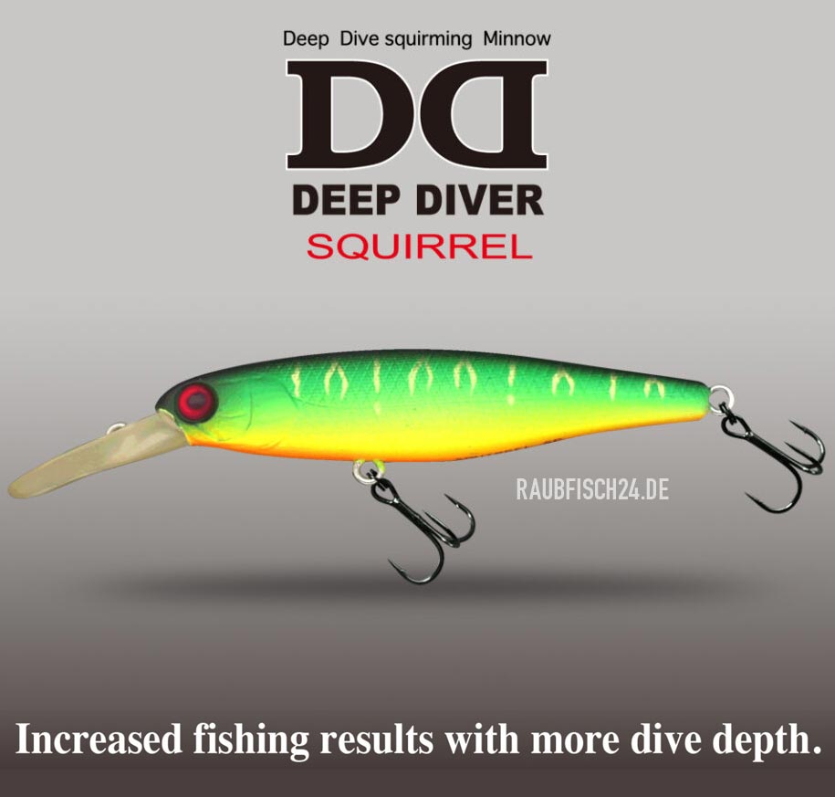 Unser DD Squirrel 67 ist nur ein paar Millimeter größer als der Squirrel 61, seine längere Tauchschaufel läßt ihn allerdings auf über 2m abtauchen, ideal wenn die Räuber in tieferen Regionen hinter kleinen Beutefischen her sind. Alle anderen positiven Eigenschaften der Squirrel Familie sind eingebaut, er ist ein perfekter Suspender, der Panikartige Fluchten imitiert, sobald man in die lockere Schnur twitcht. Er läßt sich bei klarem Wasser natürlich auch mit ‚Speed‘ einkurbeln, ohne aus der Balance zu geraten und so mancher Barsch schnappt zu, weil er keine Zeit zum ‚Nachdenken‘ hatte.