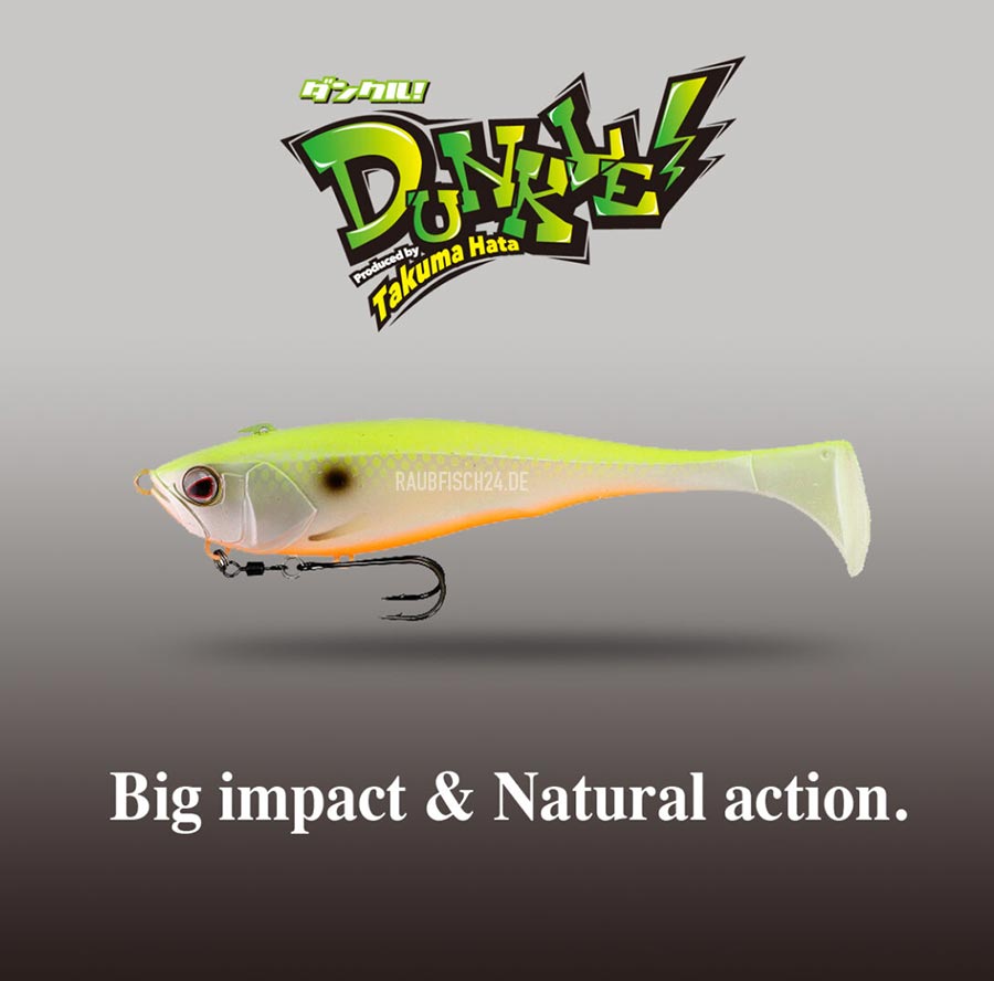 Der Jackall Dunkle 5 ist ein Soft Swimbait vollgepackt mit innovativen Features. Designed für Bass und Hecht, hilft der schwere Körper große Distanzen zu erreichen, er eignet sich aber auch perfekt für Skipping ins Gehölz oder unter Stege. Der DUNKLE ist bewaffnet mit einem superscharfen Doppelhaken, der mit Splitring und Wirbel montiert ist. Der Doppelhaken selbst wird in einem Clip in der optimalen Position festgehalten, aber nur bis zum Biss, danach kann er frei rotieren. Um auch über steinigem und hindernisreichen Grund effektiv fischen zu können, kann man an der unteren Öse den Doppelhaken entfernen, dort ein Gewicht einhängen und den Doppelhaken auf dem Clip am Rücken montieren! Genial! Der bullige Kopfbereich verjüngt sich recht schnell zum mächtigen Schwanzteller hin, dadurch lässt sich der Dunkle erstaunlich langsam fischen. Must have!
