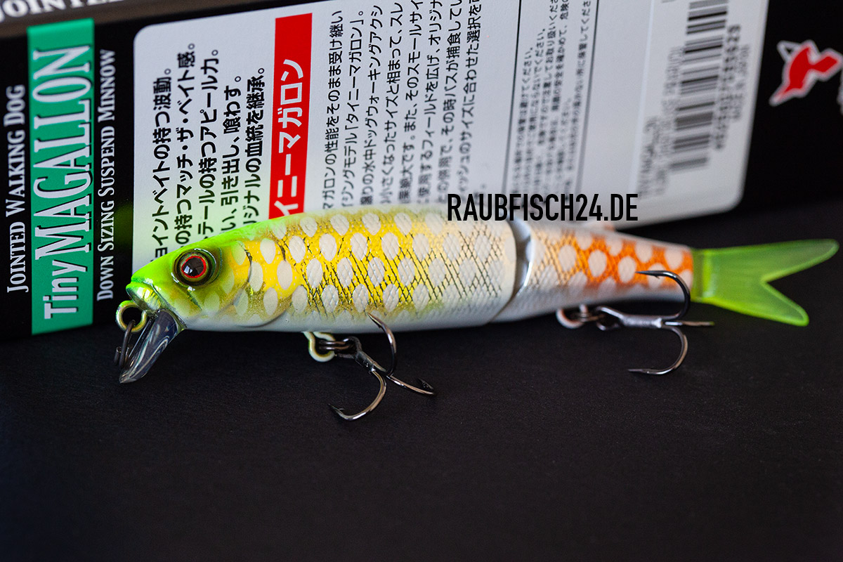 Dieser schwebender Wobbler – Jackall Tiny Magallon besteht aus zwei Teilen und taucht auf ca. 0.3 bis 0.8 Meter ab.
