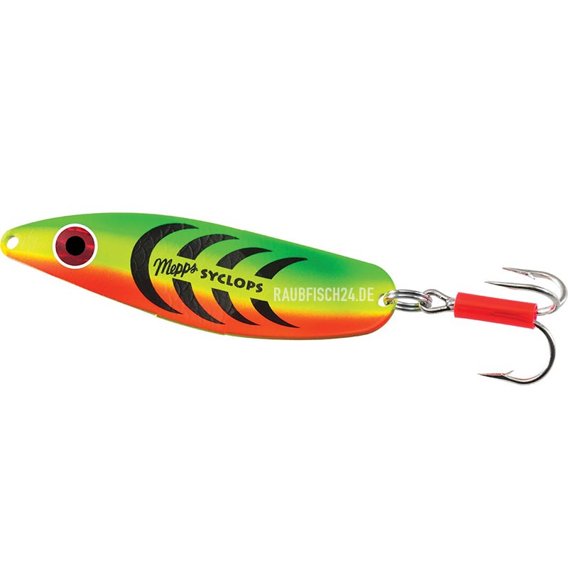 Der Mepps Syclops ist ein 3.8 cm langer Blinker. Er wiegt 5 Gramm, was ihm in Kombination mit der schmalen Form gute Flugeigenschaften verschafft.