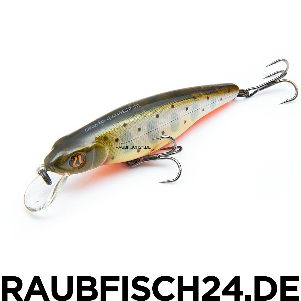Der Wobbler Greedy Guts gehört zu den bekanntesten und begehrtesten Twitchbait’s aus dem Hause Pontoon21. Seinem Aussehen nach und insbesondere aufgrund seines abhängenden ausspreizenden Bäuchleins ähnelt Wobbler Greedy Guts stark einem vollgegessenem Jungfischen. Diese konstruktive Besonderheit ist kein Zufall. Im voluminösen Bäuchlein des Wobblers befinden sich zwei ziemlich wuchtige Ausgleichsgewichte des Systems Mag Force Balance II.
