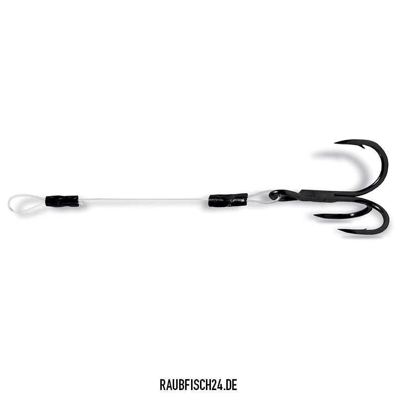 Ein typischer Stinger (Angsthaken) zum Zanderangeln. Zwei verschiedene Montagemöglichkeiten: Am Rücken des Softbaits oder durch ihn durchgefädelt. Der Stinger ist mit einem Premium-Drilling aus der 75’ Series bestückt (7547 Inline, NeedleSharpTM).